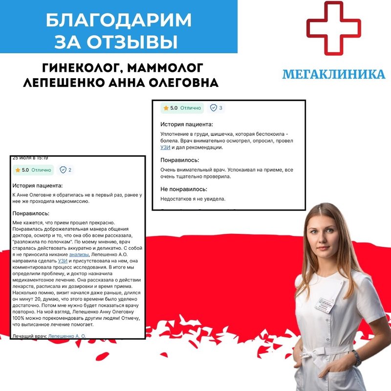 Лепешенко Анна Олеговна является гинекологом, а также работает в сфере маммологии. Врачи-маммологи в своей медицинской работе диагностируют и лечат болезни молочных желез. К ним нужно приходить на прием как можно скорее, если вы увидели красные пятна на груди, заметили беспричинное изменение размера молочных желез, нащупали уплотнения внутри молочных желез.